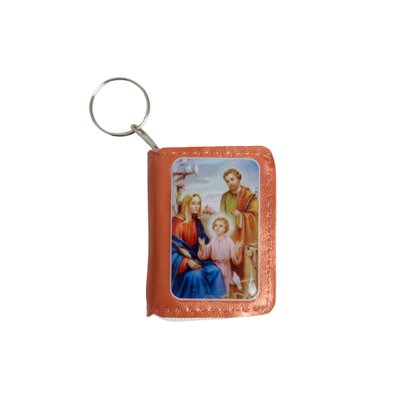Chaveiro de plástico com acabamento em corino impresso com zíper e argola.