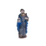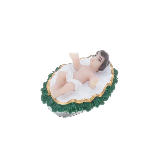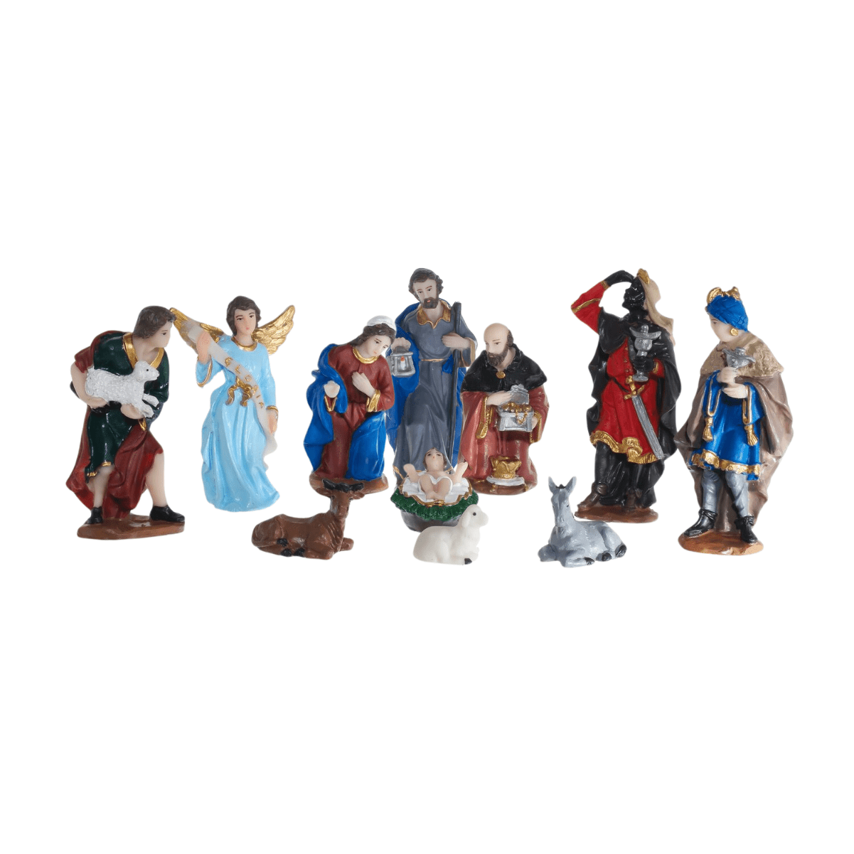 Nossa Senhora, São José, Menino Jesus na manjedoura, Santo Anjo, Três Reis Magos, pastor com uma ovelha na mão e mais três animais deitados (vaca, ovelha e burrinho).